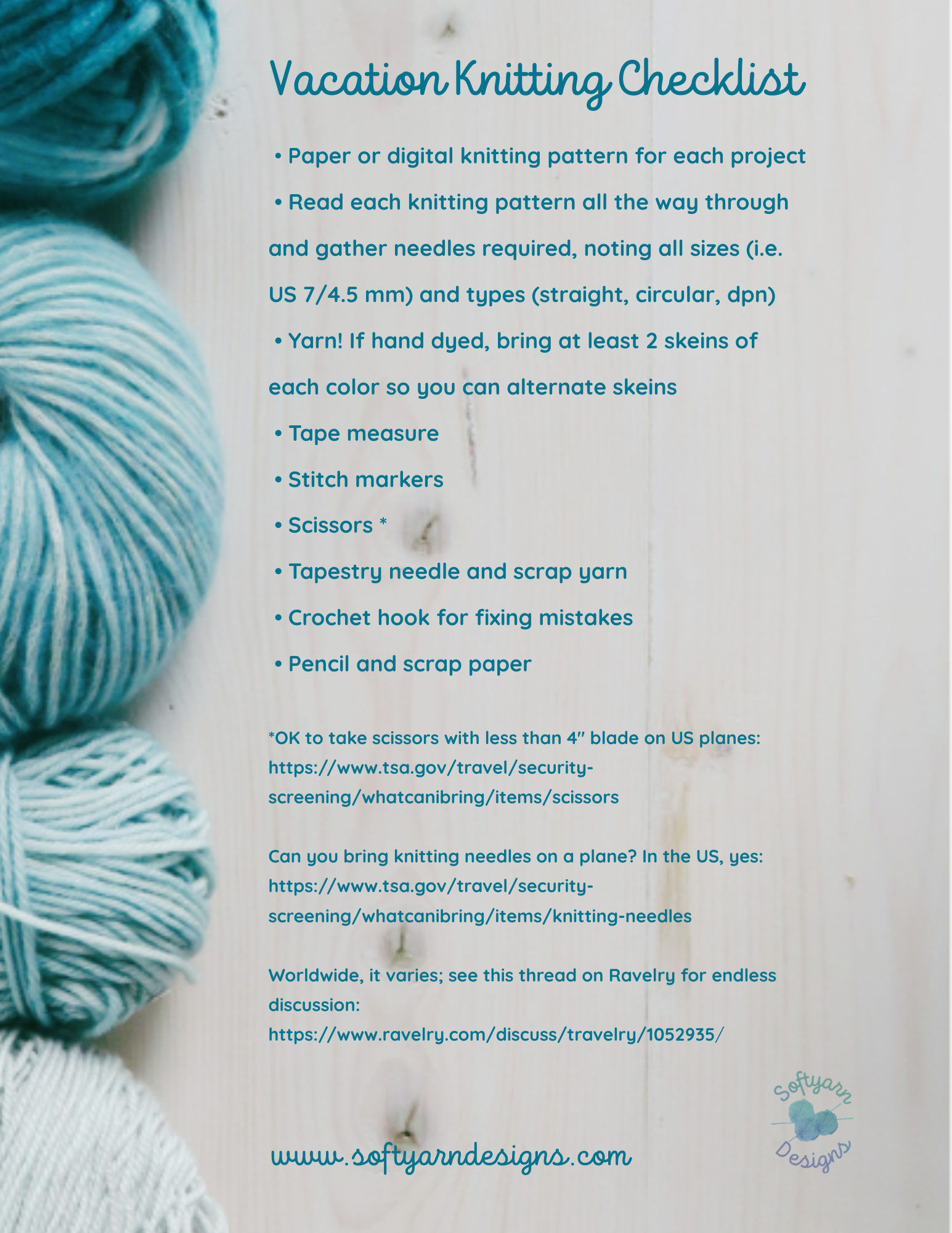 If you’ve been wondering about whether you can take your knitting needles and scissors on a plane, the checklist contains helpful links to answer those questions for the US and international travel.*